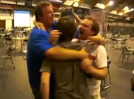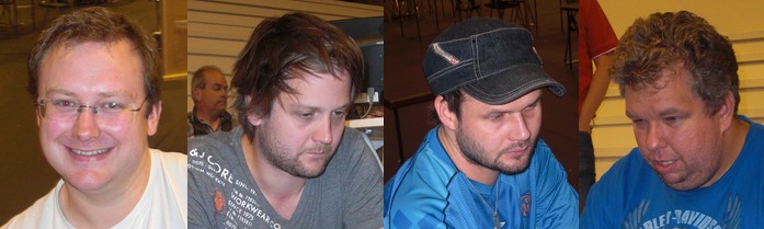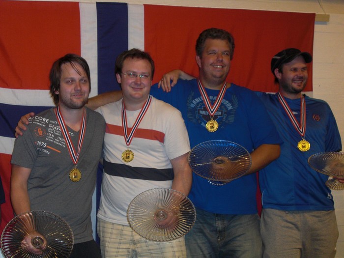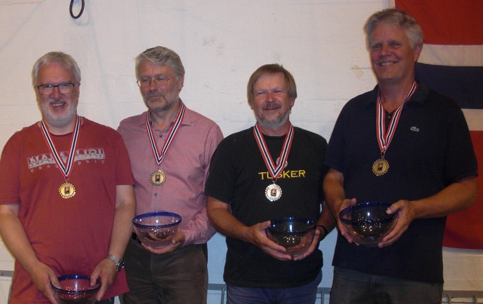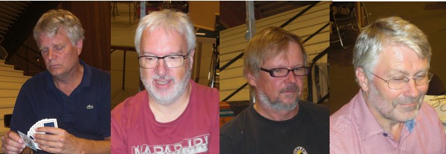 Joda, vi er så glade at!! Erik Berg har rykte på seg at han er Norges heldigste bridgespiller. I NM Åpent lag vant han kvartfinalen med 1 IMP og finalen på totalscore. Kan du kjøpe en LOTTO-kupong til meg, Erik? Jada, jada!! Vi har 140 poeng mer enn Stabell i score!! Steffen Fredrik Simonsen, Erik Berg, Jørn Arild Ringseth og Johhny Hansen Rune Andersen, Tolle Stabell, Leif Erik Stabell og Peter Marstrander