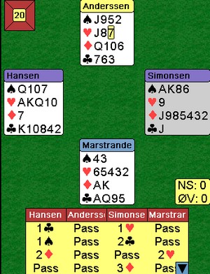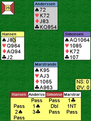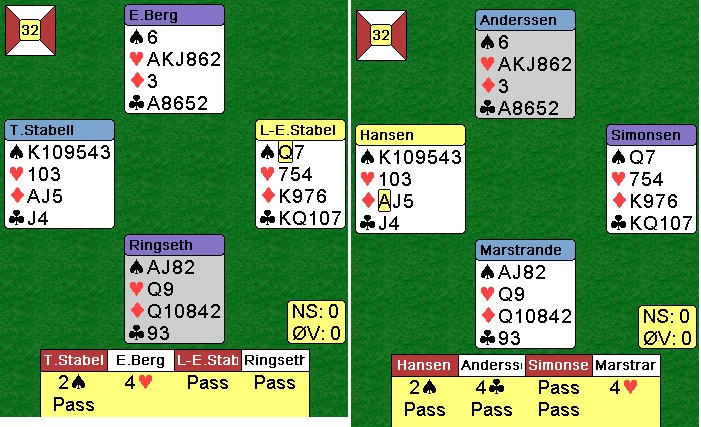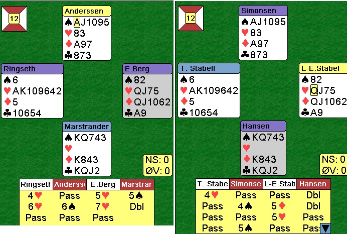 Jeg fikk ikke sett så mye på de første 16 spillene, men i dette var det gode vurderinger ved begge bord. Skal en vinne lagkamper er det helt avgjørende å lykkes i de store spillene. Peter Martrander får det tøft over 5hj fra Erik Berg, men ingen passer seg til seier i lagturneringer. Rune Andersen løfta til slem og Erik tok det sikre i 7hj. Tre hvite beiter var billig mot -1430. Legg merke til at du må spille kløver mot KDJ to ganger i 6sp, mend et er baremat for spillere på dette nivået. Steffen Fredrik SImonsen på det andre bordet visste ikke om makkers renons i hjerter og stoppa i 5sp. ØV trodde de skulle bli belønnet for å holde motparten vekk fra en iskald slem, men det både stemte og ikke stemte siden stampen i 7hj var så billig, Etter havltid er stillingen 30-21 til lag Stabell. Andre halvrunde