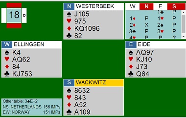 Dette spillet er fra innledende runder i NM lag. Den nye IMP-skalaen er slik at overstikk har fått en betydning også i lag. Seier med 1 IMP er innbyrdes 1 Vinnerpoeng i kamper med få spill, sånn at hvis en er rimelig sikker på overstikk kan en sette kontrakten i fare!!