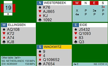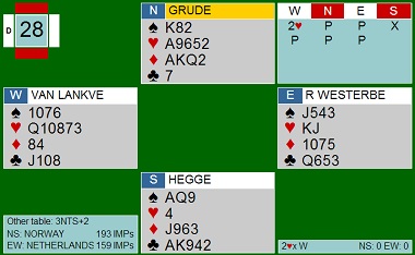 Det kan selvsagt være beit i 5sp og det kan være beit i 5kl/ru. Likevel velger Kristoffer det trygge og blir belønnet med +650 på bok. En tullete dobling av vest, fordi han levde sikkert etter prinsippet om at "når vi har meldt en utgang i sonen, kan ikke motparten får spille noe udobla." Bare vas, fordi kravpass brukes når du "vet" at motparten stamper. Det gjør du ikke her. Jeg pleier å spørre noen som dobler hjem kontrakter på 5-trinnet om de hadde dobla hvis motparten hadde meldt slem istedet for. "Nei, da hadde jeg passet", sier flere av dem og hører ikke en gang den manglende logikken. Jeg tar til tårene