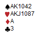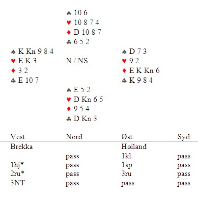 når jeg ser spill som det under. 1ru viser hjerter og 2ru krever til utgang. Resten er sunn fornuft og toppbridge!! Manglende logikk