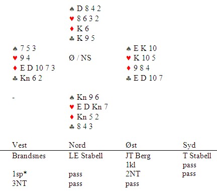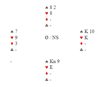 Jeg har fått ny mentor i bridge, en hyggelig men tidligere tannløs atletisk ung mann fra Larvik. Det er for stengt å påstå at han har sluttet å telle honnørpoeng, men det er ingen overdrivelse å si at hans fascinasjon for tiere og niere er større enn hos oss andre. For å si det mildt. Han drømmer om Palmstrømske honnører nesten hver natt. Et viktig kort i spillet under. Hittil har jeg ledd litt når han har snudd ryggen til, men jeg oppdager etter hvert at han har et poeng. Når vi teller 4-3-2-1 for hhv. ess, konge, dame og knekt, så tar vi ikke høyde for at løse honnører er mindre verdt enn honnører som henger sammen, og når honnørkombinasjoner er forsterket med tiere og niere har de ofte langt større stikkpotensiale. Hvis du teller honnørpoeng uten å ta hensyn til det jeg sier over, er disse fargekombinasjonen likestilte i din verden. I eksemplene skal du tenke deg at du har de minste manglende kortene på hånda (4-5-6 f.eks) EKn10 vs EKn2 ED10 vs ED2 KKn109 vs KKn32 K109 vs K32 DKn10 vs DKn2 Jeg kunne ramset opp en mengde andre lignende kombinasjoner, men jeg regner med at du tar poenget. Kombinasjonene til venstre er verdt minst ett stikk mer, noen ganger to og andre ganger tre stikk mer med den rette honnøren i kapp. Se for deg f.eks KKn109 i forhold til KKn32. I den første har du tre stikk med damen i kapp hver gang du har tre tasser på hånda. Til høyre har du bare ett, to hvis fargen sitter 3-3. Flere av kombinasjonene til venstre kan spilles fra hånda og likevel gi stikk. Jeg bakspilte noen runder under NM par og da kom dette spillet: ØV spiller mini-NT (8-12) i disse soneforholdene, så derfor kunne ikke Jan Tore Berg åpne med 1NT. Gjenmelding av 1NT, vil vise 13-16. Han hadde seksten honnørpoeng, men tre tiere og en 98-kombinasjon. Riktignok ingen femkort, men likevel oppvurderte han til 17-19 med 2NT. Det var kun to av 16 bord som var i 3NT Tolle Stabell spilte ut spar 9, svenske utspill. Dette er typisk fra knekten tredje. Den gikk via damen til esset. Så ruter til tier og konge. Leif Erik Stabell skifta til hjerter 2, svenske som viser fire stykker, som gikk rundt til syd sin knekt. Spillefører var markert med kongen tredje i hjerter, så Tolle fridde seg i ruter som bordet vant med damen. Nå gikk faktisk toget for NS. Kløver knekt ga fire stikk i fargen. De tok spillefører og gikk inn i bordet og hentet to ruterstikk. Før den siste ruteren er stillingen: På hånda forsvinner hjerter konge og syd er skviset. Mentoren min kikke bort på meg da spillet var ferdig og jeg kunne se stoltheten bre seg i ansiktet. "Hva er det jeg har sagt om tiere?" Spar 10 hindra først syd å spille fargen da han var inne på hjerter knekt. Det ville drept alle skviser. I sluttposisjonen var spar 10 en trussel: Hjerter 10 hindra motparten å ta fire stikk i fargen. Hadde nord hatt tieren, kunne han skifta den i stikk tre og beita 3NT. Ruter 10 tetta ruteren. Sammen med 98 på hånda tålte spillefører honnør fjerde i syd. Kløver 10 tetta fargen og ga fire kløverstikk uten å slippe inn motparten. To uten tieren. Jeg må krype til korset.