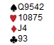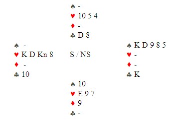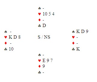 Som giver passer du opplagt, det samme gjør vest. Din makker i nord åpner med 1 ruter, og øst melder 1 spar. Du passer igjen, og det samme gjør (overraskende nok) også vest. Det er tydelig at nord og øst har de fleste toppkorta i stokken, og nord velger nå å doble opp igjen. Dette bør vise 4 korts hjerter og kort i spar. Øst passer, og nå er det opp til deg, hva melder du?