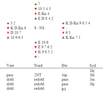 Jeg bakspilte Kåre Kristiansen som vest i dette spillet og sjelden har han vært mer sikkert på beit i en redobla kontrakt. Spillefører var ikke inne på sporet, men det er mye som tyder på at hjerteren sitter 4-0.