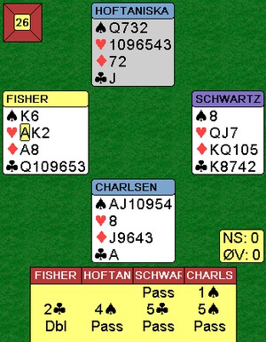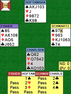Jeg er ikke helt sikker på hva 2kl fra Hoffa er i andre melderunde. De spiller en Gazelli-variant over 1Major - 1NT og det ser ut som dette er noe av det samme. (2kl viser en god hånd- minst 15 hp) I alle fall ble 2kl alertert ved bordet. De andre meldingene kan jeg heller ikke forklare, men de greide i alle fall å tåkelegge så mye at motparten ikke fant det drepende sparutspillet. Det kunne virke som hjerteren var det svake punktet og øst startet med hjerter 7.