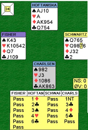 Lagturneringa i Monaco er i gang og der spilles det nå syv kamper a 10 spill før sluttspillet starter i morgen (tirsdag) ettermiddag. De to beste møtes da i en 20-spillskamp for å avgjøre seieren, mens de andre 14 lagene spiller Monrad om tredjeplassen. Thor Erik Hoftaniska og Thomas Charlsen spiller for engelske Janet de Botton og var på BBO i tredje runde. Kampen endte 23-23, ikke minst takket være denne tøffe slemmen av nordmennene.