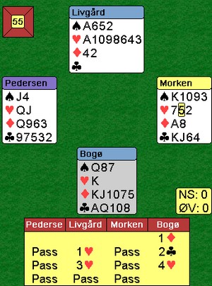 FLERE DAMER ENN PÅ MANGE ÅR Det er gledelig at damene også begynner å invadere de største turneringene. Å innvadere er vel kanskje ikke rett ord å bruke, men jeg kan ikke huske sist så mange som syv av 104 spillere er jenter. Aud Veseth ligger på en flott andreplass. Skal vi få damemedalje for første gang på lenge? FV: Rønnaug Asla, Pernille Lindaas, Astri Margrethe Grønnesby, Maja Rom Anjer, Torild Heskje, Anita Ower og Aud Veseth STILLINGEN ETTER DAG 1 ET SPILL MED MANGE SKVISMULIGHETER De fleste kom i 4hj i nord, men minst en spilte kontrakten fra syd og fikk kløver ut fra vest rett opp i ED. Det forsvant to ruter og elleve var sikret. Så hjerter konge, kløver til stjeling, ut med trumfen og en liten spar mot bordet. Øst stakk og nå lå kløver ti singel igjen i bordet. Det ble fristende for øst å ta for kløver knekt og fjerne bordets kløver 10. Det skulle han ikke gjort, for med fire kort igjen er dette stillingen: Jeg har fjernet vest sine kort fordi han er ikke med i spillet. På hjerter tre ser du sikkert at øst er ferdig. Det kom en analytiker inn til meg og sa at øst kan bryte denne skvisen ved å spille mer spar når han er inne på kongen! Javel, sa jeg, satte meg i nord og slapp sparen til esset. Nå tar jeg alle trumfene unntatt de to siste. Stillingen er: Jeg tar for den nest siste hjertern og øst er trumfskviset. Kaster han kløverknekten eller ruteresset, går det spar til damen og avkast av en spar på det godspilte kortet. Kaster han en spar, spiller jeg spar til damen og stjeler et minorkort. Spartassen gir det siste! STILLINGEN ETTER RUNDE 19 ALLAN LIVGÅRD TRAFF RUTEREN i dette spillet. Å få overstikk er jo det parturnering handler om og han spilte slik: Øst fant et greit utspill med hjerter fem. Allan vant med kongen, stjal en kløver, hjerter ess og hjerter 10 tok ut trumf. Så ruter til kongen (!), kløver ess og bort med den andre ruteren. Øst fikk to sparstikk til slutt. Et resultat i takhøyde. Jeg spurte Allan hvorfor han spilte til kongen og ikke tok kappen. "Sett deg i øst sitt sted og spill ut. Med ruter damen foran bordets femkort-farge, ville du ikke spilt ut aktivt? Når han startet med trumf, var det mye som tydet på at han hadde esset. Det jeg tenkte på, var om han kanskje hadde ED og at det likevel var rett å kappe. Det er også mye som tyder på at øst har sparkongen, siden han ikke startet der. Et argument for å kappe ruteren er at en kan gjøre seg uavhengig av sparfordelingen, men det er også skvisvarianter i sluttspillet bare jeg får beholdt overgangen i spar" DET ER KANSKJE DÅRLIG GJORT av meg å skrive om slike spill som det under, men hjerneblødende misforståelser er jo en del av bridgen? Jeg skal ikke en gang prøve meg på å fordele skyld, unntatt å si at det var Eide som meldte galt. PRISEN SOM FORSVANT? Terje Lie er en glimrende spillefører og når han traff sparen i dette spillet, gjorde jeg meg klar til å innstille han til prisen for beste spill.