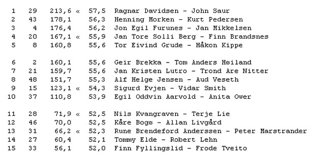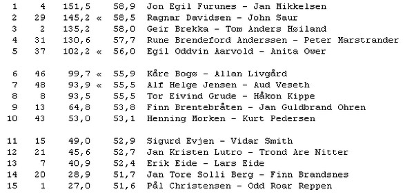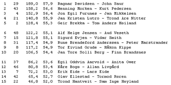 Sammenlagt etter 4 kvelder: 1 Bekkeli/Engen 225,00 2 Haug/Haug 217,50 3 Moen/Jansrudvangen 215,50 4 Brakalsvålet/Brenna 212,10 5 Jacobsen/Arnesen 199,10 6 Hansen/Langbråten 192,60 7 Elserud/Nyhus 184,60 8 Ovlien/Haug 178,70 9 Aasum/Hornmoen 178,40 10 Buserud/Pedersen ( 2 kvelder ) 110,00 11 Hummel/Utsi ( 2 kvelder ) 102,50 12 Amundsen/Dalseth ( 1 kveld ) 45,30 13 Sjøvika/Anderson ( 1 kveld ) 42,60 14 Haug/Aanerud ( 1 kveld ) 35,20