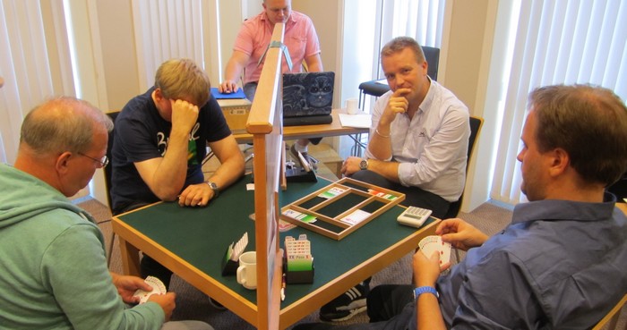 Tre favoritter på pallen i NM par 2014 Sølv til Nils Kvangraven - Terje Lie, vinnerne Håkon Kippe - Tor Eivind Grude og bronse til Ragnar Davidsen - John Saur RESULTATER Det er mange som fortjener skryt etter helgas NM arrangment. Lyngdal BK med Calle Knutsen og Karl Olav Hansen i spissen hadde lagt alt til rette for både stab og spillere-. Gaute Ubostad sitt strandhotell leverer varene på alle mulige måter. Spesielt maten de serverer er av prima klasse, langt over hva i alle fall jeg er vant med fra hoteller. Helge Mæsel var myndig, rolig og god turneringsleder. Markus Bruno hadde som vanlig full kontroll på regnskapet, selv når det kokte litt på slutten med protester, apeller og feildubletter. Takk til dere alle!! Calle Knutsen, Markus Bruno, Helge Mæsel, Gaute Ubostad og Tom Danielsen fra NBF. Mari og Isabelle var dyktige kortdelere i alle tre dagene. De var nok sannsynligvis de to som gjorde minst feil i helga. Bortsett fra Markus Bruno da..