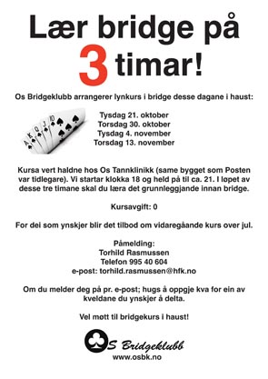 Jon Sveindal måtte av helsemessige årsaker be om avløsning til å skrive bridgespalten i Aftenposten. Mange var redde for at avisen benyttet anledningen til å legge ned nok en bridgespalte, men heldigvis tok de til vettet og engasjerte på nytt. Takk de alle de som har bombardert avisen med krav om at Aftenposten må fortsette å skrive om verdens tøffeste hobby. Jeg ønsker en fargerik person, Tommy Sandsmark, masse lykke til med spalten sin. Bridgefaglig kan jeg nok ikke gi han mange råd, men går han tom for vitser er det bare å sende en forespørsel.