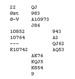 Nå kartet ikke stemmer med terrenget, har vi bridgespillere (meg selv inkludert) lett for å skylde på terrenget. I det siste har jeg skrevet om at jeg ikke er fornøyd med mange meldingsforløp etter åpning 1kl. Når det går f.eks 1kl - 1sp * ("overføring" til 1NT) 1NT synes jeg det blir gjettverk om vi skal spille med eller uten trumf. Det sammen med 1kl - (innhopp) - ? og makkeren til åpneren ikke har major. Da bir det tust. Derfor har jeg tenkt høyt om det kan lønne seg å åpne med 1ru på f.eks 3-2-4-4 hender, siden en ofte ikke får vist noen farger ved å åpne med 1kl. Om dette har noe for seg eller om det er mitt vanlige vas, vet jeg ikke. I går skulle jeg i alle fall teste.