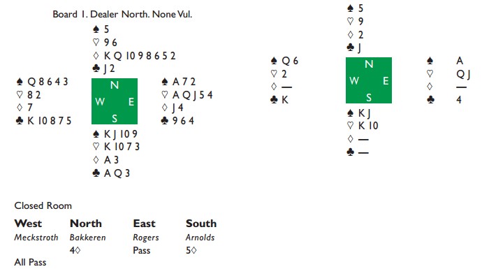 Denne skvisen er i tre farger, men øst er på en måte truet bare i to av dem. Den siste fargen er komminikasjon til makker og den måtte han kvitte seg med. Øst hadde et vanskelig utspill og startet med hjerteress. Så skifta han til kløver, men spillefører gikk opp på esset og tok syv ganger ruter. Før den siste er posisjonen som oppe til høyre. Øst kan ikke kaste majorkort, så da må kløveren gå. I bordet forsvinner hjerter ti og så spar fra hånda. Pent!!!