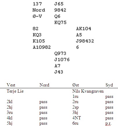 Sør var gjevar med alle i sona, og opna 1 hjerter. Vest sa pass. Kva melder du i nord no? Det er ei hand som nok var lettare å melde i gamaldagse system: Nord kunne seia 2 ruter, sør for eksempel 2 hjerter, og om nord no melde 3 kløver, hadde han vist handa si utan å krevja til mer enn 3 ruter. Men i dag bruker mange 2 over 1 som utgangskrav med mindre ein etterpå gjenmelder minoren sin, og det kan ein ikkje godt gjere med femkorts. Mange ville nok likevel meldt 2 ruter på farten i nord, men det store spørsmålet ein egentlig må ta stilling til allereie før si fyrste melding, er om handa er verd å krevja til utgang med. I lagkamp er vel svaret kanskje ja, handa er spelesterk mot nokre nøkkelkort hjå makker, men i parturnering er eg skeptisk. Hadde ein i det minste hatt dobbelton hjarter og singel spar, då kan 4 hjerter fort vera aktuelt. Men heilt utan tilpass i makkers farge, utan stoggar i spar og med to fargar som båe manglar esset og som dimed kan bli svært vanskelege å få henta i 3 grand, trur eg ein bør nøye seg med 1 grand over 1 hjerter. I ein del tilfelle vil sør koma attende med ei oppmuntrande melding, men i dette tilfellet seier han 2 hjarter. Kva no? Det er eigentlig lite som har endra seg; grand verkar motbydelig og hjertertilpasning har ein ikkje. Nord valde pass og alle lo av korta som kom på bordet, men med greitt motspill fekk sør berre ni stikk. Nord var nøgd med meldingane sine, då 3 grand frå hans hand bør være ei enkel beit med det sannsynlege sparutspelet: Ein kan ikkje stikke korkje fyrste eller andre spar, for då har forsvaret kommunikasjon til å ta tri sparstikk og to ess, men dukkar ein to gonger kan dei ganske enkelt ta for spar ess, ruter ess og kløver ess. Diverre hadde nesten alle i Tromsø BK 1933 meldt noko slikt som 1 hjerter – 2 ruter; 2 hjerter – 3 kløver; 3 grand. Dimed var kontrakten i sør, og med spar ut derifrå må aust halde attende esset for å beite. Det kan ikkje ha skjedd, for alle vann 3 grand. Men det bør vera ein tankekross at 3 grand teoretisk sett var ein elendig kontrakt, sjølv om sør med spar konge og gåande hjarter hadde ein regelrett kval. Han kan ha mykje dårlegere kort for opning 1 hjerter, og då er det iallfall langt fram til utgang.