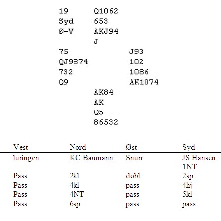 I fyrste hand gunstig sone opna sør 1 spar, og i staden for ein tung 1 grand valde nord å melde 2 kløver, som i praksis var utgangskrav. Sør støtta til 3 kløver, nord sa 3 ruter for å høyre om 3 grand kunne vera aktuelt, men sør avslo den ideen med 3 spar. Nord måtte lette til 4 spar, ein god kontrakt. Hjarter dame kom ut, og no var aust lur då han stakk med kongen for å halde fram med esset. Sør stal og spela en spar til kongen og esset, før hjerter ti kom opp att til ny steling. Mange ville vel no daska ned spar dame, for ei beit direkte, men sør hadde merkt seg åttaren i vest, og drog ein kløver til esset og ein spar mot handa, med plan om å leggje niaren om aust fylgde lågt, ei forsikring mot 4-1-sits. Men aust rekna med at dette var sørs plan, og la i spar ti. Då vest kasta ein hjarter på spar dame, måtte sør gjera eit vegval her. Han har to trumf igjen, like mange som aust, som framleis har spar knekt og krav på eit stikk der. Utfordringa er å halde aust frå eit stikk på spar fire. Det er to alternativ: Ein kan ta konge, dame i kløver og spela ruter ess, konge, dame, som set knekt, fire i spar på mellomhand. Om aust då fylgjer, kastar eit kort eller stel høgt, kastar sør sin siste kløver, og stel aust stel sør over og spelar ståande kløver. Men dette går jo gale med ein gong om aust frå start hadde dobbel eller singel kløver eller singel ruter. Den andre moglegheita er at aust berre hadde tri hjarter frå start, då kan ein halde fram med spar ni som pressar ut knekten, og aust har ikkje noko tilbakespel som trumfmattar sør. Det som fekk sør til å velja sistnemnde variant, den tapande slik det sat, var at aust stakk over hjarteren i fyrste stikk. Det vil ein som planlegg trumfmatt veldig fort gjera med trikorts hjarter, medan det er fort gjort å gløyme det med firekorts. Kanskje feil spela, men sør ville neppe gått i baret om ikkje aust hadde prøvd å tåkeleggje spelet for han.
