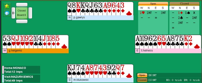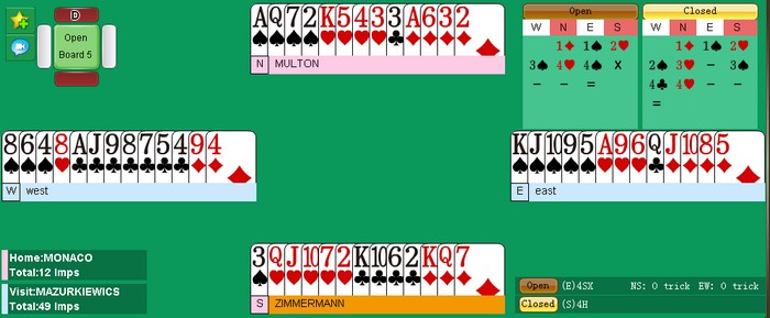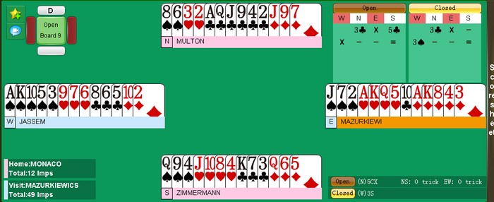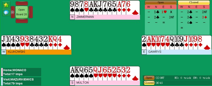 når Zimmermann startet med singel spar tre mot stampen. Av en eller annen grunn valgte å Multon å ikke stikke den og da fikk spillefører fire sparstikk hjemme, to hjerterstjelinger og to ess for åtte stikk. Det ble -300 mot 620 på det andre bordet der polakkene vant 4hj. Spar ess og mer spar holder spillefører nede på syv stikk. _________________________________________________________________________________ 3NT vs 4sp Det er som regel bedre å spille 4 major enn 3NT på 5-3, men selvsagt ikke alltid. Denne gangen var det i alle fall ti stikk i spar og beit i 3NT. med hjerter ut til esset og ruter knekt i vri var det ikke mulig å vinne 3NT. 4sp spilte seg ikke selv, men polakken fant vinnervarianten. Hjerter ut til esset og ruter knekt til esset. EK i kløver og bort med to ruter. Ruter til stjeling, hjerter til stjeling, ruter til stjelilng og hjerter til stjeling. Nå var det "bare" å stjele en kløver med spar seks og claime ti stikk. _________________________________________________________________________________