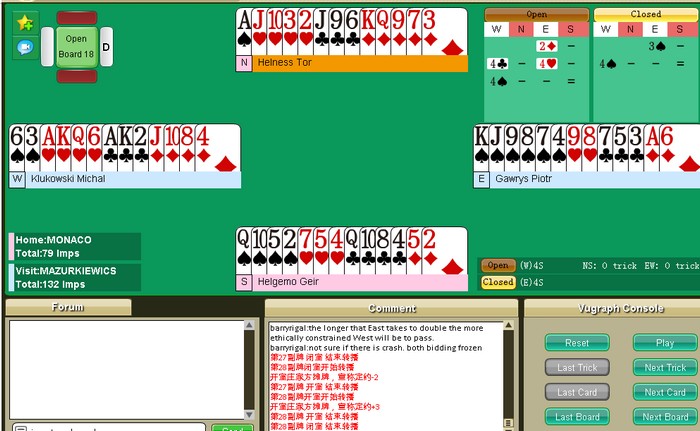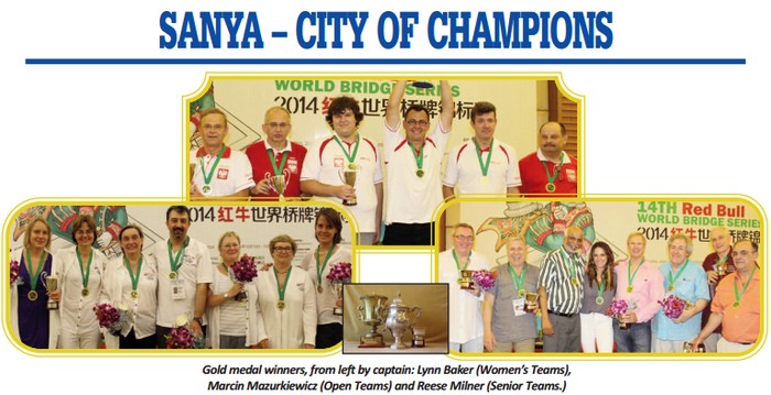 Denne gangen ble det polske laget litt for sterkt for Monaco - Zimmermann. Jeg finner ikke detaljer fra kampen og det tror jeg delvis skyldes Internetproblemer i Kina og at finalen ikke vises på BBO, men på Kina sitt eget "OurBridge". Jeg vet at sponsoren ofte spiller de første to sesjonene, og ser du på resultatene kan nok det stemme denne gangen også. Trykk på bildet over, så kommer du til resultatsiden og der kan du se scorearket for hver av de fire sesjonene ved å trykke på runderesultatet. Så vidt jeg ser, er det ingen kort å se. Det er arkiv på Ourbridge sine sider og der kan du se alle spillene. Du må først lage deg en konto, men det er lett. Her er vinnerlagene fra hhv. Åpent, Damer og Senior.