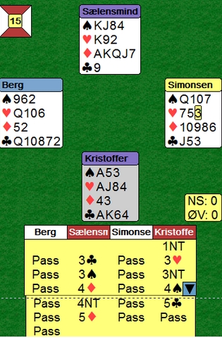 Dette spillet viser at det kanskje ikke er så lurt å spille odde konvensjoner i nye makkerpar. Silla og Christer Kristoffersen tror jeg ikke har spilt særlig sammen før, og når Geir Helgemo ikke stiller denne helga må lag Hauge mikse rundt på parkombinasjonene. Jeg ser at Silla og Christer har avtalt "Hopp til tre-trinnet etter 1NT, viser singelton". Så tipper jeg at avtalene stopper der og resten må sunn fornuft overta. Da går det sånn: