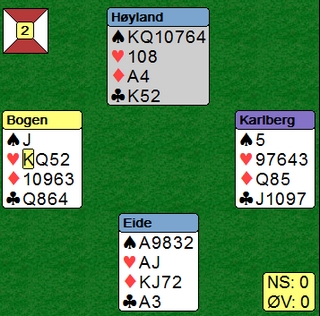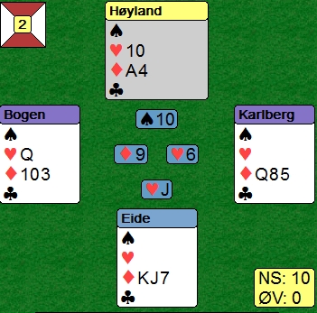 avhengig av ruterdamen. Vest-Adger hadde stoppet i 6sp, er kontrakt som lett ble vunnet. Hordaland Sven Olai Høyland og Magne Eide meldte seg helt opp til 7sp. Ser du alle kortene vinner du lett alle tretten stikkene ved enten å stjele ut ruterdamen eller ta kappen. Magne Eide fant en spillplan som var en tredje variant. Hjerterkongen ut til esset. Så en gang spar, tre ganger kløver til stjeling og all trumfen. Med tre kort igjen er stillingen som under. Legg merke til at Håkon Bogen kasta ruter ni og beholdt treeren. Under ruter ess la han tieren og da har jeg stor forståelse for at Magne Eide spilte på at vest var skviset. 100 inn til Vest-Agder og 17 IMP i stedet for 2210 ut og 13 til Vestlandet. Det er små marginer som gir store utslag i bridge.