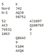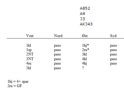 og det kom i dette spillet. Poenget er at øst vet at makker har akkurat tre spar og ikke kontroll i fargen. Uten spardamen, vil det alltid være beit. Selv med spardamen hos makker vil 6kl være avhengig av sparkongen rett plassert. Det trenger heller ikke være nok, fordi det er ingen garanti for at de røde fargene er uten taper. Du vet også at den trettende sparen ikke vil kunne brukes til noe selv om makker har damen, kongen sitter rett og fargen 3-3. I mine øyne en opplagt pass på 5kl. Makker kan selvsagt ha denne hånda: DJ10,Kx,EKx,xxxxx. Ikke en eneste bortkasta honnør. Treffer du makker med slike kort, bør du levere inn LOTTO samtidig fordi da er det din dag. Og faktisk kan du likegodt melde 7kl fordi sparkappen går på slike dager. De aller fleste parene i 1.divisjon spiller kløverføringer, men hele 7 av 12 bord meldte 6kl med beit da makker ikke hadde spardamen. Flere brydde seg ikke om å invitere en gang, men buste av gårde til slem når makker hadde vist er 12-14 NT med minst fire kløver. Hardt?