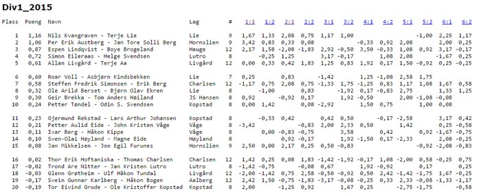 Jeg likte at det ble publisert butler for bare 1.divisjon. Den viser et mer korrekt bilde av resultatet innbyrdes mellom de beste. I 2.divisjon er nivået meg ujevnt og det er letter å score godt for de beste parene der. I 1.divisjon henter Nils og Terje fine +1.16 sammenlignet med et snitt av de andre. Fem landslagspar blant de syv beste vitner om at Vennerød har tatt med de beste i troppen sin. Trykk på resultatene under for å få detaljene.