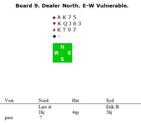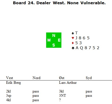 Det er ikke så mange som deler spill og historier med meg. Til tross for gjentatte oppfordringer om å komme med gode, heldige, dårlige og morsomme spil, så må jeg suge det aller meste av eget bryst. Så da Lars Arthur Johansen ringte meg og fortalte om noen spill fra helgas EM klubblag, ble jeg rett så glad. Dere som kjenner LA, vet at han er en beskjeden gutt som verken vil skryte av egne prestasjoner eller fortelle om det som gikk galt for lagkameratene. Så hvis det kommer noen spill i fra tureringa som også viser forspilte muligheter, er det kun fordi at jeg presset han (hardt) I det første spillet synes jeg Peter Fredin la en felle for Jørgen Molberg som jeg på en måte har forståelse for at han gikk i. På den andre siden føler jeg det var den andre beita i en kontrakt på 5-trinnet han ofra. selv om det langt fra var sikkert at det var slik det var.