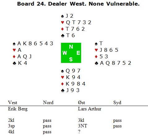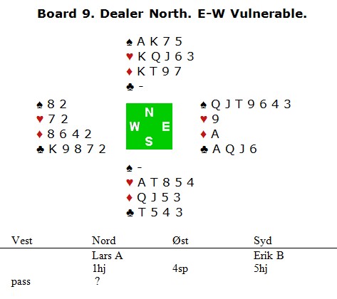 "Kunne vi klart å meldt denne slemmen?", spurte Lars Arthur. Jeg vet ikke, men skulle det være sjanse så må Erik tolke passen på 6hj som singelton og EK i ruter? s