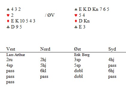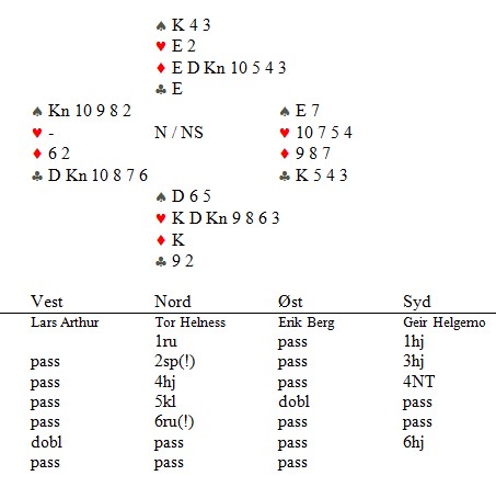 Legg først merke til Tor sitt hopp til 2sp. Hvor mange ganger i livet ditt har du brukt hopprevers uten å kunne meldt hånda på annen måte? Dette har Tor og Geir tatt konsekvensen av og endret til at 2sp i denne sekvensen er utgangskrav med ruter, en hånd som ikke passer til 2kl-åpning men er for sterk til 1ru - 1 x - 3ru. Jeg tipper dette er etter innspill fra den polske mentoren Martens. Erik Berg dobler 5kl for utspill og nå skjønner jeg ikke Tor Helness sin 6ru. Redobler ikke alle for å vise esset? Geir var i alle fall sikker på at Tor hadde kløverkongen som måtte beskyttes i utspill og passer derfor 6ru. Så dobler Lars Arthur 6ru for å si at han er renons i hjerter og ballen går tilbake til Geir. Geir ser for seg dette motspillet: Hjerter ut til stjeling, kløver gjennom makkers konge og enda en hjerterstjeling pluss kløverdamen. Tre dobla sonebeiter i en frivillig slem! Geir plukka derfor ut i 6hj og regna med å gå en beit med kløver ut. På en god dag har makker KJ i fargen og damen sitter i kapp. Nå stemte nesten ingenting av dette og 6hj sto som et seil. Mer enn litt heldig, spør du meg.