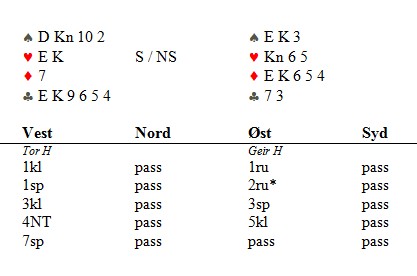 Dette spillet var høydepunktet for to norske bakspillere i Nationals i Providence. I følge min referent viste Geir sin 3sp trekort-støtte og Tor trengte i verste fall kløveren 2-2 hvis makker hadde tre små der. Nå ble det tidlig julekveld når kløveren satt 3-2.