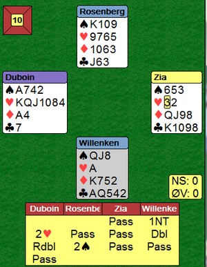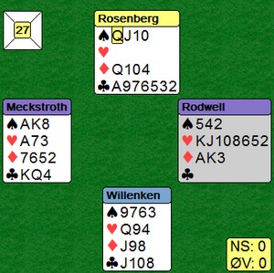 Hj 10 kom ut og jeg gjorde et dumt trekk ved å dekke med knekten. 10-er ut er oftere topp av «ingenting» og plasserer damen. Nå drepte V knekten med damen og ikke noe var avgjort, men nå måtte mye mer løse seg. Etter hj A tok jeg ut trumf ved sp J og ny til damen. Ø sakte hjerter i 3. stikk. Finner jeg kl J direkte kan slemmen vinnes med tre stikk, og jeg valgte kløver til 8-er. Da den dro esset var det for sent å spille ruter. Jeg stakk jo, spilte kl 9 som fikk seile og deretter sp D som rensket trumfen. Så kl K og inntak på hj A til stående kl D ga avkast av ru D.