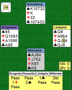 Ø følte seg ursterk og doblet, men det var et slag i utide. Sp A ut ble stjålet, og hyggelig sist i ruter gjorde spillet greit for N. Bare taper til kl K og 1 overstikk ga +950. Ved det andre bordet fikk Egil Nordby (Ø) tilslaget i 2 spar og klarte å trylle hjem den kontrakten. Mestrene vant dermed 14 imp på spillet. To par, lag Leiang og lag Torsnes (Rømoen- Mosby) klarte for øvrig å melde 6 kløver og vinne kontrakten, men brorparten av lagene i A, B og C spilte bare delkontrakter.