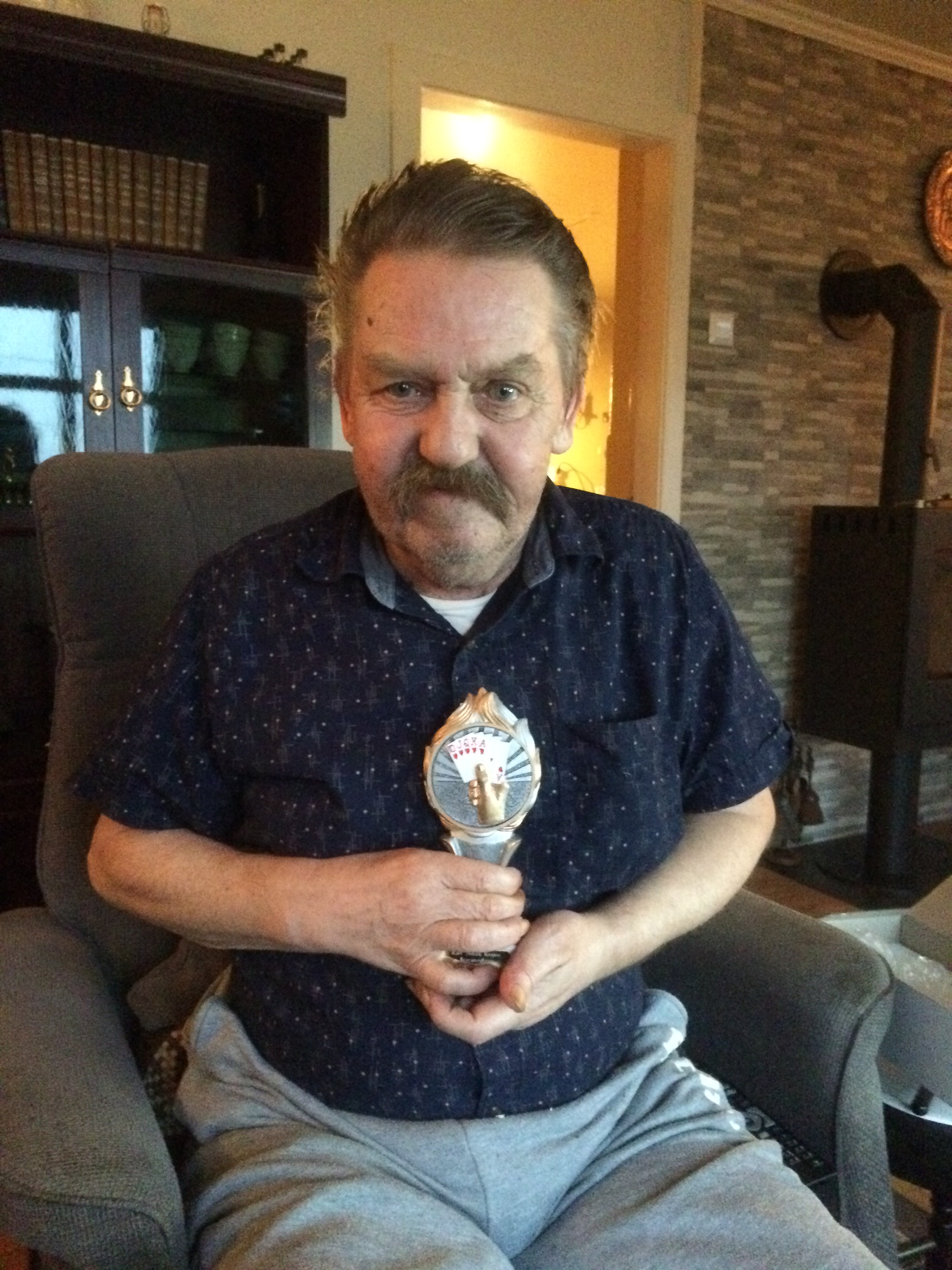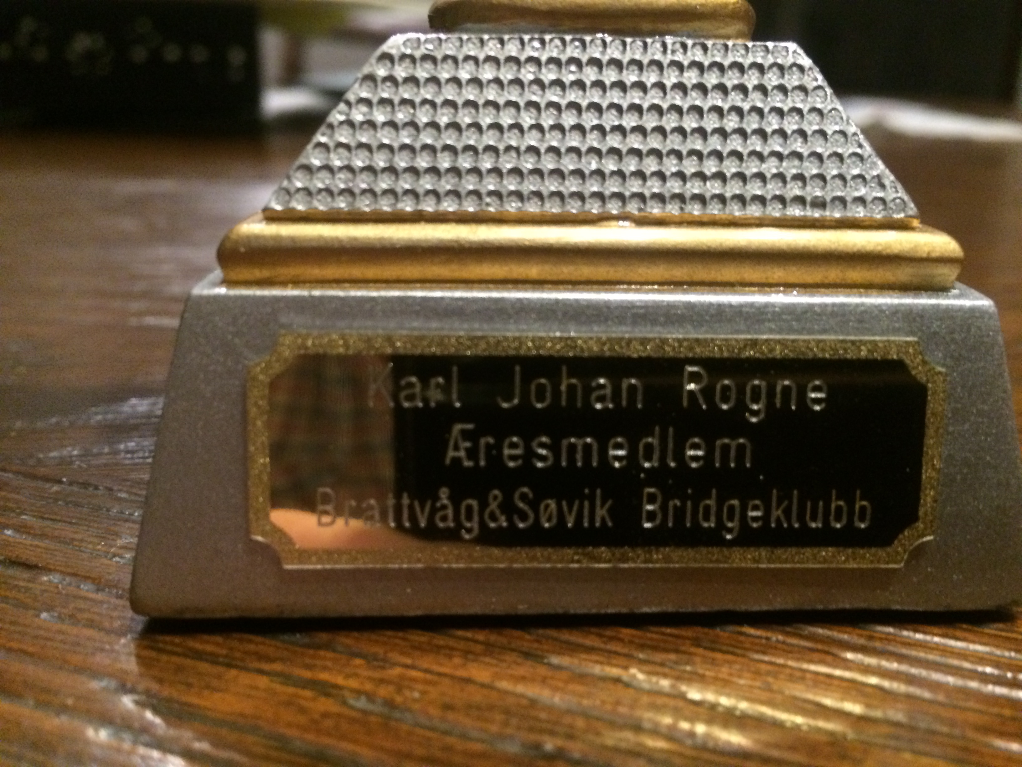 Ble idag tildelt statuetten som bevis på att han er utnevnt til Æresmedlem i Brattvåg&Søvik Bridgeklubb.Det var en stolt og glad Kalle som tok imot statuetten.Ett meir verdig medlem til å få denne statusen skal vi vel leite lenge etter. Kalle har vore en bauta i klubben i alle år og ej er sikker på alle i klubben stemmer i sammens med meg: Gratulerer kjære Kalle, det er deg vel unt. Kalle ba meg også hilse til ALLE i klubben og takke så masse.