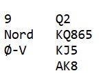 Det er ikke så lett å se om vest legger kløver 10 (skjuler to mindre kløvere enn syveren) eller kløver 6 (skjuler toeren). Men det kan vel neppe bli veldig feil å spille den andre kløverhonnøren i andre stikk uansett?