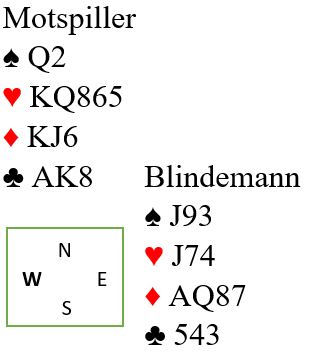 La oss si du passer og makker melder 5 hjerter. Så melder Ø/V 5 spar. Den er det fristende å doble, og gjør du det går det pass rundt. Mot 5 spar doblet spiller du ut en kløverhonnør og får se blindemanns kort: