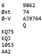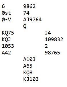 N/S kan vinne ti stikk i hjerterkontrakt. Så å være med til 5 hjerter er bra mot 4 spar som ikke kan rokkes, i sparutgang eventuelt doblet blir det ti stikk med beste motspill, ellers elleve stikk.