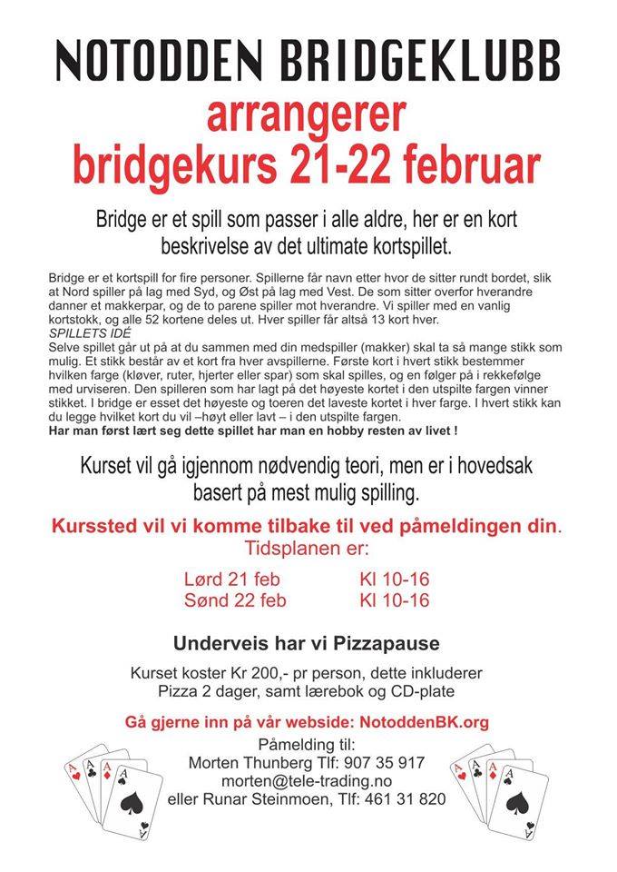 Ellers skal vi arrangere bridgekurs 21 og 22 februar. Deretter har vi rekruttbridge hver onsdag for å følge opp nye og de litt mer etablerte spillerne som vil trene litt. Det er påmelding, så si ifra til Morten eller Runar. Her kan du lese litt mer om dette. Si ifra til familie, venner og kjente :)