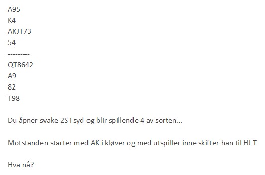 av Bard Olav Aasan Jeg skal hjelpe deg litt i gang,( selv om det finnes flere mulige spilleplaner). Du stikker med hjerterkongen og tar for sparesset. Knekten faller til høyre. Nå vil jeg tro mange spiller hjerter til esset og stjeler kløveren med nieren i bordet. Så trumf. Ser ikke dette enkelt ut nå da? Nei, du har oversett et fint lite poeng. Hvis vest har Kxx i spar og singel ruter, kommer du deg ikke hjem for å ta ut trumfen når han skifter til ruter! Det unngår du elegant ved å ta for en ruterhonnør før du spiller trumf. Ja, det kan bli galt med ruteren 5-0, men 4-1 er tross alt mye mer sannsynlig. mvh BOA