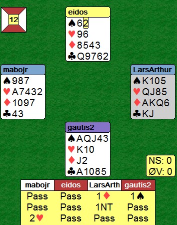 Makker spilte ut en svensk spar to til knekten. Så spar ess og spar til stjeling. Kløver tilbake og spillefører gjorde rett når han brukte knekten. Kjell Gaute Fyrun vant med esset og spilte ?? Spar til trippelrenons!! Har makker trumfesset er det alltid beit, men har han nieren forfremmer de et hjerterstikk. De holdt kun motparten nede på åtte i stedet for ni, men fin bridge er alltid moro å se på.