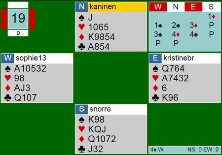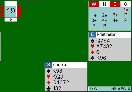 Når jeg ser på sjakk, klarer jeg ikke å tenke langt nok fram. Jeg er faktisk så dårlig at jeg sjelden klarer mer enn et par trekk før jeg mister oversikten. I bridge er jeg bedre, men i går oppdaga jeg akkurat den samme tilkortkommenheten som i sjakk. Jeg var en god stund fornøyd med ressonementet mitt, men i ettertid holder det ikke vann. Du har selvsagt ikke noen problem med slike spill Makker spilte ut ruter to, norske utspill, til dame og ess. Så ruter til stjeling, spar til esset (makker hadde knekten), ruter til stjeling og spardamen fra bordet. Nå er stillingen: Jeg ser at hjerteren sitter 3-3, så derfor virker det som det haster å få fjernet kløveresset som inntak. La oss si jeg spiller hjerterkongen som står, så mer hjerter til esset og hjerter til stjeling. Ut med min spar ni og kløver mot kongen. Der ligger to hjertertasser og venter. Derfor skifta jeg kløver knekt som gikk til kongen. Men tell trumfen da, Snurr!! Spillefører har spilt to ganger og må bruker en tredje for å fjerne min nier. Hvis jeg i posisjonen over spiller ruter, går den fjerde trumfen. Den femte må han bruke på å stjele god hjerteren og når spillefører prøver å komme seg inn i bordet, stikker makker rett og slett med esset og har den trettende ruteren for beita. Akkurat som i sjakk. Jeg tenkte ikke langt nok fram. Skuffende!! Spillefører kan alltid vinne ved å finne kløveren og hun burde også gått på hjerteren tidligere. Det har ingenting med saken å gjøre i denne sammenhengen.