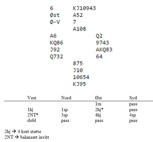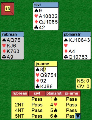 Hvis jeg ikke tar feil, skal Peter og Rune representere Norge i høstens VM for senior i India. Det er lenge siden Norge har vært med som kvalifisert til et VM og seniorklassen har et nivå som ikke er langt fra åpen klasse. Jeg håper NBF viser at de setter pris på at seniorlaget vårt kvalifiserte seg og dermed legger forholdene godt til rette for de tre parene som skal være med. Det er gjennom gode internasjonale prestasjoner vi setter Norge på bridgekartet. At formen er bra, viser dette spillet. Når det er funnet nikort trumftilpass, er renonser kjempeviktig å få fortalt om. Både fordi det kan lede veien til storeslemmer med et ess vekk, men det gjør også makker i stand til å vurdere sine kort på en bedre måte: KJ i hjerter var ikke det beste Rune kunne ha, men ta nå vekk dem og han vet at ruterkongen og kløveresset er med å tetter makkers farger. 5sp viser to ess og trumfdamen og når Rune i vest ser ned på den selv, vet han at makker har minst seks spar. 5NT er storeslemsinvitt og viser alle nøkkelkort. Hadde Peter hatt kløverkongen i stedet for damen, ville han vist den. Rune hadde fulgt opp med en ny invitt med 6ru og storeslemmen hadde blitt meldt. Nå visste vest at det var en kløvertaper og de stoppet kontrollert i 6sp for nesten 10 pluss ppå BBO. Der får et voldsomt betalt for slemmer, men 6sp + 1430 er pluss i alle turneringer. Gi feks øst en hjerter og 6sp hadde vært steindød.