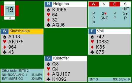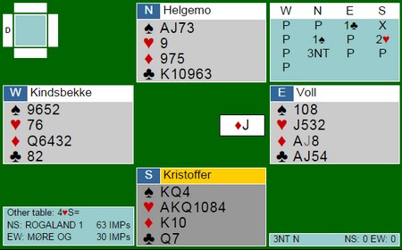 Jeg skreiv lenger nede om et fint spill av Roar Voll. Her er det Geir Helgemo som imponerer med et godt ressonement. Roar Voll finner et fantastisk utspill med ruter knekt!! Vest legger styrke når kongen vinner. Så fire ganger spar og vest "Smith'er" ved å legge sparen på en måte som viser at han likte utspillet. Det tolker Geir som av han har Dxxxx og at utspillet er fra EKnx. Øst åpna med 1kl og hadde bare to spar. Da ser det unektelig ut som 2-4-3-4 fordeling. Så til åpningsstyken. Øst har vist EJ i ruter og har maks EJ i kløver. Det blir ti honnørpoeng. Det er vel odds for at han hadde passet med fire små hjerter? Trykk på spillet så ser du hvordan Geir førte kortene. (Spill 24 lukket rom)