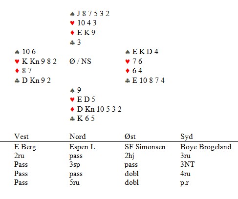 Hvis er ser isolert på resultatlista fra Seriemesterskapet, virker det som Hauge tok en klar seier. Det er langt fra tilfellet, fordi det var noen yderst få spill i siste kampen som avgjorde. At Nils gikk 1100 i 2rux er litt tilfeldig og uheldig. Det er nok i ingen vits å melde seg på i slike spill, i alle fall med en passet makker, men vi har gjort det alle sammen ustraffet. En vinner ikke i bridge ved å tro at en skal passe seg til seier, men dette var i alle fall ikke gangen å doble 1hj. Spillet under er et spill der Boye Brogeland vurderer bedre enn Asbjørn Kindsbekken. Boye spiller ut hjerteress, mens Kindsbekken inviterer. Med sparesset er det liten vits i å spille ut en liten hjerter. Spillefører har ofte bare Dx i hjerter og da er det viktig å ikke gi bort stikk for den. Forbindelsen har ØV i spar hvis øst skulle hatt f.eks Knxx i hjerter og syd Dx. Eller som sitsen er her. Motparten har ikke invitert, så det er meget mulig at de har åtte minorstikk når de kommer inn. 13 fortjente IMP. I første halvrunde vant Hauge syv spill med små IMP'er, blant annet tre femmere. De er også viktige, spesielt i innbyrdes oppgjør. I lagkamp må en være mye forsiktigere enn i par, men det går ikke an å være for passiv heller. Boye var flink og passet ut 1sp og vant akkurat syv stikk. På den andre bordet kom NS i 2sp med en beit. 5 IMP. Jeg vet ikke om vest bør melde 1NT i utdøende over 1sp, selv i lagkamp. Denne gangen vinner ØV lett 1NT. Hadde det vært feil å melde 1NT i vest i utdøende. f.eks hvis nord hadde vært sterk og kunne doblet for å vise tillegg, hadde jeg vel skrevet "GALEMATIAS" når Kindsbekken betalte ut 800 i stedet for 80.