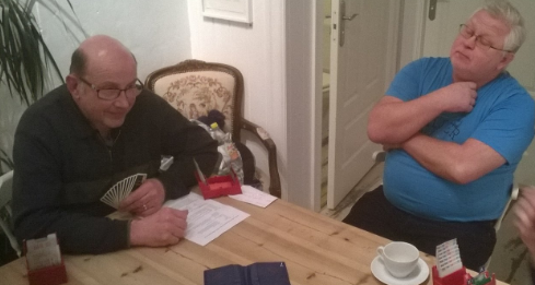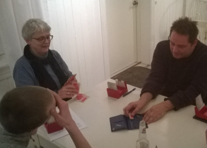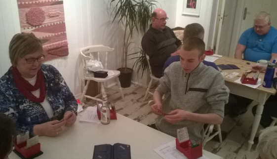 ....med bridgespillere på Anne på Landet i går. Frank har samlet sammen ett godt knippe med helt ferske og mindre rutinerte spillere for bridge i trivelige omgivelser, og hele to fulle bord var en gledelig nyhet. Og så enkelt kan det også gjøres! Frank har hverken utstyrt seg med flotte powerpointer eller tjukke kursbøker, men baserer seg på en enkel innføring og mye spilling. "Learning by doing"!