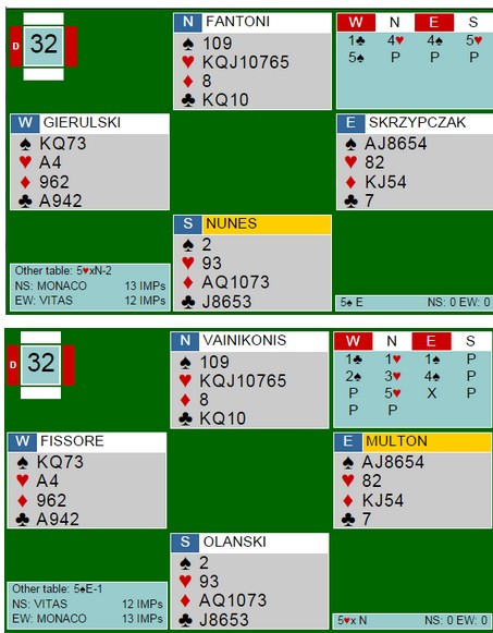 ble vunnet av Monaco, men denne gangen uten Tor, Geir og Pierre Zimmermann. Det gjorde ingenting. RESULTATER Sett press på motparten. Det er godt å se at teorien stemmer i praksis. Som oftest i alle fall. God taktikk er som regel å prøve å ta fra motparten plass til å utveksle opplysninger. Ingen mennesker gjetter riktig hver gang og dess oftere en setter motparten i situasjoner der de må trekke et eller annet opp av meldeboksen, dess oftere gjør de feil. Fantoni melder 4hj første gang og makker Nunes er med til 5.trinnet. Jeg skjønner godt at Gierulski meldte 5sp. Han var vel nærmere å invitere til slem, men 5sp kunne ikke vinnes. På det andre bordet meldte nord først 1hj, så 3hj og til slutt 5hj. Helt alene. ØV fikk god tid til å finne ut hva de burde gjøre og tok inn to dobla beiter for 300 + 100 = 400 og 9 IMP. Nei, bridge er mange ganger ikke så vanskelig. Det er bare å gjøre det som står i lærebøkene. Ikke finn opp spillet på nytt. Store deler av de lagene og spillerne vi skal kjempe med i framtidige mesterskap er med. Norge er hjemme.