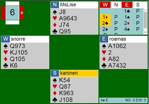 1 ruter. Du har 13 hp, og av to firekorts-farger melder du den lavest rangerte først.