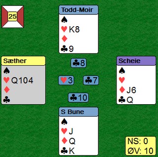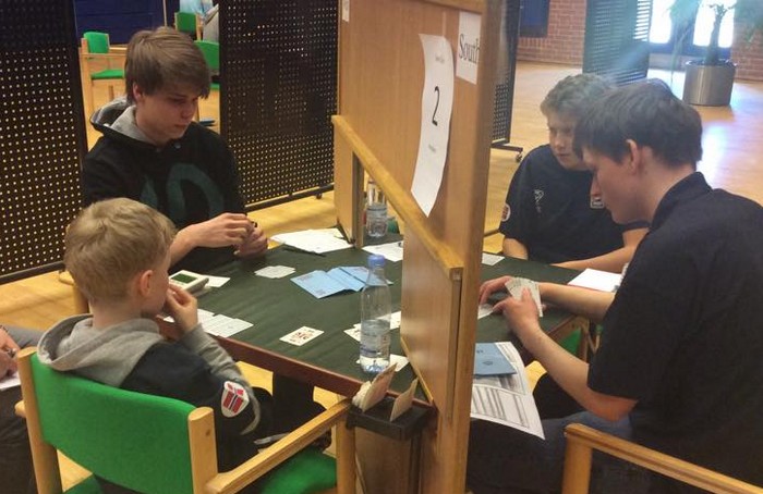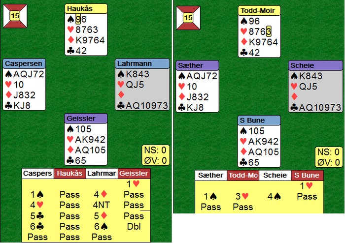 Gode norske valg Du skal spille 6hj i øst og får et heldig ruterutspill til tieren som står. Når du ser alle kortene, vinner du lett tolv stikk, men jeg er ikke sikker på hva som er statistisk beste spilleplan. Markus Scheie valgte å stjele to spar i bordet. Han kaster derfor to kløver på EK i ruter og spilte seg fram til denne posisjonen. Pang og ned med hjerterdamen for +1430. Alternativ spilleplan er å kaste en spar og en kløver på EK i ruter. Da holder det å stjele en spar og du kan ta for hjerteresset og spille hjerter mot damen. Da må en ta kløverkappen. Denne gangen går den og hjerteren kommer av seg selv. Det kan godt hende Markus Scheie sin plan er like god. Den står på å finne riktig hjerterhonnør dobbel, pluss at nord bør helst ha bare tre spar. ____________________________________________________________________ Joakim Sæther og Markus Skeie ser ut til å komme til finalen i U20-klassen i Nordisk 2015. Her var det danskene som var bedre enn de norske Poenget er danskens 3hj, sperr, over 1sp. Nå fikk ikke øst splintret i ruter og måtte derfor nesten melde 4sp. På det andre bordet passet norske Ole Andre Haukås i nord og etter 4ru kom danskene i den glimrende sparslemmen. Det ser skummelt ut å sperre uten kort i ugunstig, men min erfaring er at en svært sjelden blir tatt etter slike stund. ___________________________________________________________________________ Dette er IKKE lagbridge! og danskene tok opp konkurransen mot en delkontrakt i kløver. Det kostet 1400 i beit på 5-trinnet. De juniorene, de juniorene! Norge hadde også et dårlig resultat på dette spillet. Norske nord åpnet med 2sp og øst meldte inn 3hj. Syd doblet (!) og måtte spille med knvien på strupen for å beite. Har motparten mesteparten av honnørstyrken og er i en kontrakt du ser neppe er den beste, er det bare å passe å ta inn plussen. Det er jo heller slettes ikke sikkert at meldingene er slutt på 3hj. Danske øst spilte veldig bra i 3hj x, og lusket hjerter ni fra hånda. Syd ble grådig og la liten. Så hjerteresset og så ble syd strippet for frikort. -530, men det var ikke så farlig mot 1400 inn på det andre bordet. Ikke farlig når motpartens hjemspilte doble delkontrakt gir 13 IMP inn.
