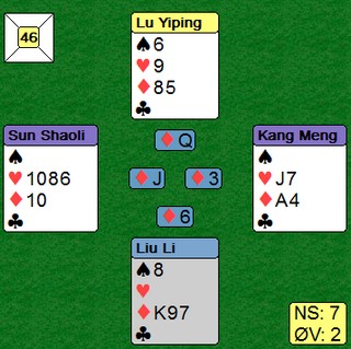 En må ha hovedfag i matematisk kombinatorikk for å skjønne hvordan sluttspillet i Yeh Bros funker, i alle fall hvis en ikke har fulgt med hele veien. Det er noe med trekantspill, der beste lag av tre møter vinneren av en tidligere kvalifisering. SE HER SÅ FINNER DU SIKKERT UT AV DET. Tar jeg ikke helt feil er det "Red Bull" og "China Open" som kjemper om seieren. Her er hvem som spiller på de ulike lagene. De norske, Boye Brogeland, Erik Sælendsmind og Terje Lie, er alle utslått for en god stund siden. De spiller et Monrad slutspill, men det går ikke all verden der heller. Resultater finner du (kanskje) i linken over. _________________________________________________________________________ Her er et spill der god teknikk ville ført til vunnet kontrakt.