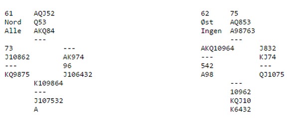 Ingenting er umulig når det gjelder kortfordlinger i bridge, men at tre slike spill skal komme etter hverandre i de tre siste i en turnering, er i praksis ikke mulig vel? Hva som ha skjedd skal jeg ikke spekulere i, men saken er sendt til Utvalg for turneringsvirksomhet og de behandler saken. Inntil videre er derfor resultatet fra Østfold og Follo ikke offisielt enda. Trist for spillerne, ikke minst for de parene som kvalifiserte seg til NM par. NBF kommer med mer info når utvalget har fattet sin beslutning. Kåre Bogø og Allan Livgård vant KM i Østfold og Follo, men pr. i dag er ikke resultatet offisielt.