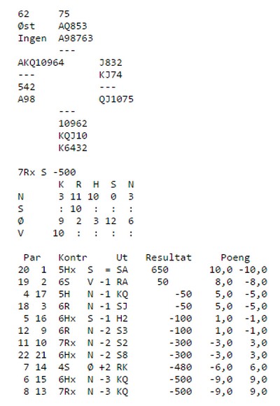 Det var visstnok en fjøsnisse som hadde tukla med korta i siste runde. Jeg vet ikke akkurat hva, hvordan og hvem, men uansett svært uheldig. Utvalg for turneringvirksomhet har sett på saken, men de hadde nesten ikke noen annen mulighet enn å la resultatet stå. Spillerne er i alle fall uskyldige og alle gjorde så godt de kunne i siste runde. Det ble mer bingo enn bridge, men jeg tror ikke det hadde blitt større endringer om de så hadde sletta de tre siste spillene. Jeg håper i alle fall den som ordna kortfila ikke gjør denne tingen igjen. Han eller hun bør vel strengt tatt få inndratt førerkortet for korteleggingsmaskina en stund?