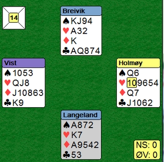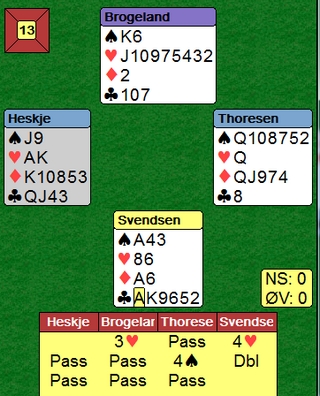 Siv Thoresen er ikke mørkredd og finner en fin stamp. 4hj står lett i elleve stikk, men selv om Tonje og Tone fant ruterstjelinga ga det bare +500. 4 IMP mot 650 på det andre bordet. Der passet Kristine Breivik og øst åpnet med 2sp. Nå ble det vanskelig å stampe. Så en liten systemsak jeg har sett flere misse på. Denne ble ikke så dyr siden 2sp heller ikke går hjem, men en annen gang er syd uten med en bløff. Doblingen av 1sp viser spar og da burdet vel Siv tatt ut 2hj til 2sp? When i doubts, bid once more.. er en god regel. Det blir ikke alltid rett, men jeg tror det er vinnende i det lange løp. I alle fall i dette spillet og Torild Heskje kunne se makker notere +650. 5hj koster 500, men for vest kunne dette vært et spill hvor det stor utgang begge veier, til og med på 5-trinnet. Slike spill MÅ vinnes, landslagsdamer!! Det er ikke meningen å henge ut enkeltspillere, men de som er i landslagstroppen må tåle å få kritikk når slemmer som er til å slenge i veggen spilles bort. Kontrakt 6sp og hjerter ut fra øst.