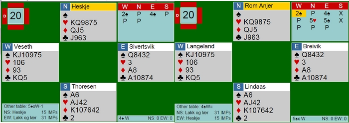 Denne artikkelen vil bli oppdatert etter hvert som jeg skriver om spill eller får inn fra dere. En vinner ikke bridge ved å passe.. I går skreiv jeg om et spill der Siv Thoresen med hell meldte seg på i 4sp uten særlig kort. I dette spillet var det Pernille Lindaas som fikk presset motparten et hakk opp. 5sp er en god stamp fordi 5hj står som et seil. Likevel 14 IMP ut mot 620 i 4sp på det andre bordet. Her avgjøres mesterskapet Skal en vinne turneringer og ikke bli nummer to, trengs det en porsjon glid i tillegg til gode ferdigheter. Isolert sett er denne slemmen ikke spesielt god, men hvem tenker på det når ruterdamen faller dobbel? Syd viste en 22-24NT med firekort spar og da er det vanskelig for Tonje i nord å stoppe under slem. De valgte 6NT på syds hånd i stedet for 6sp, Den beste slemmen om en skal være ute. Stine Holmøy stamper i ugunstig Det er sjelden noen god ide, men Stine ser at det er mange stikk i kløverkontrakt samtidig som hun neppe kan beite 4sp. Som jeg sa tidligere denne helga: "When it doubts, bid once more.." Syd turde ikke la ØV spille 5kl, for det kunne meget godt stå i elleve stikk. 10 IMP til Hells Angels som fikk spille 4sp på det andre bordet. Legg merke til at 5kl er en god stamp og går bare en beit (-200), så uansett aksjon fra syd er dette en sekser inn. Så enda et glimrende spill av Gunn Tove og Stine Trykk på spillet og se en flott spilleføring for ti stikk. (Spill 9 Åpent Rom)